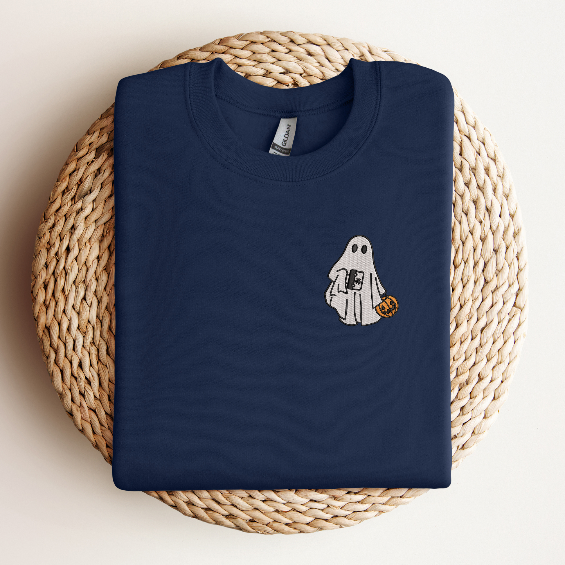 - Embroidered ghost with medical bag and pumpkin design